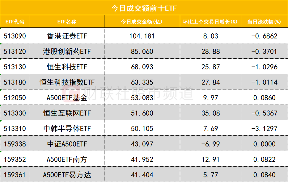 从成交额前十的ETF来看,香港证券ETF(513090)成交额位居首位,港股创新药ETF(513120)成交额位居次席。