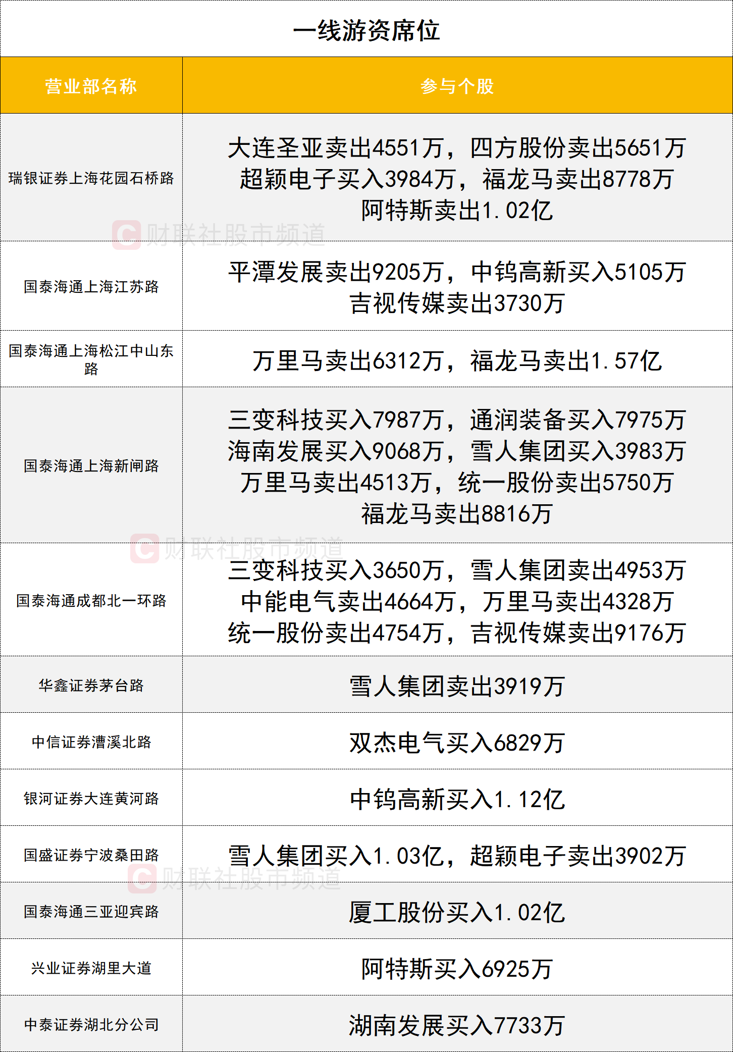 一线游资活跃度有所提升,中钨高新获国泰海通证券上海江苏路和银河证券大连黄河路分别买入5105万、1.12亿。
