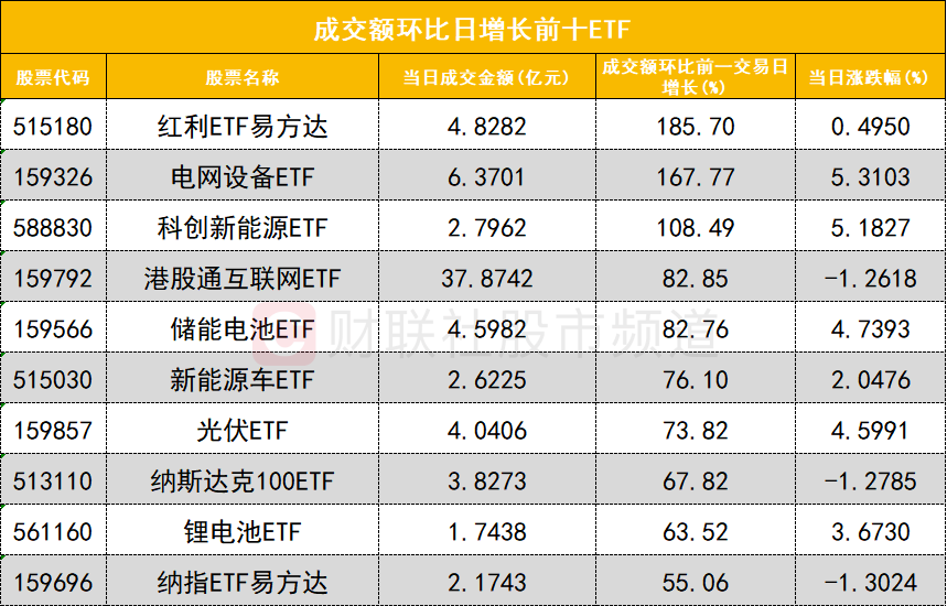 从成交额环比增长前十的ETF来看,红利ETF易方达(515180)成交额环比增长185%位居首位;电网设备ETF(159326)成交额环比增长167%位居次席。