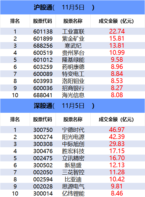 从沪股通前十大成交个股来看,工业富联位居首位;紫金矿业和寒武纪分居二、三位。