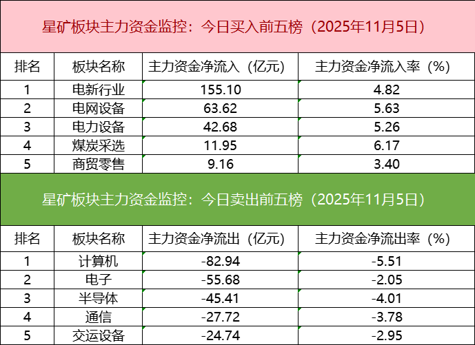 从主力板块资金监控数据来看,电新行业主力资金净流入居首。