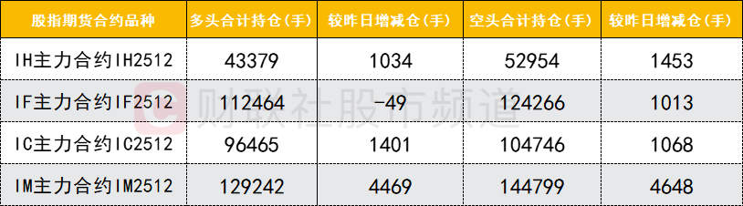 四大期指主力合约中,IH、IC、IM合约多空双方均加仓,IH、IM合约空头加仓数量较多。
