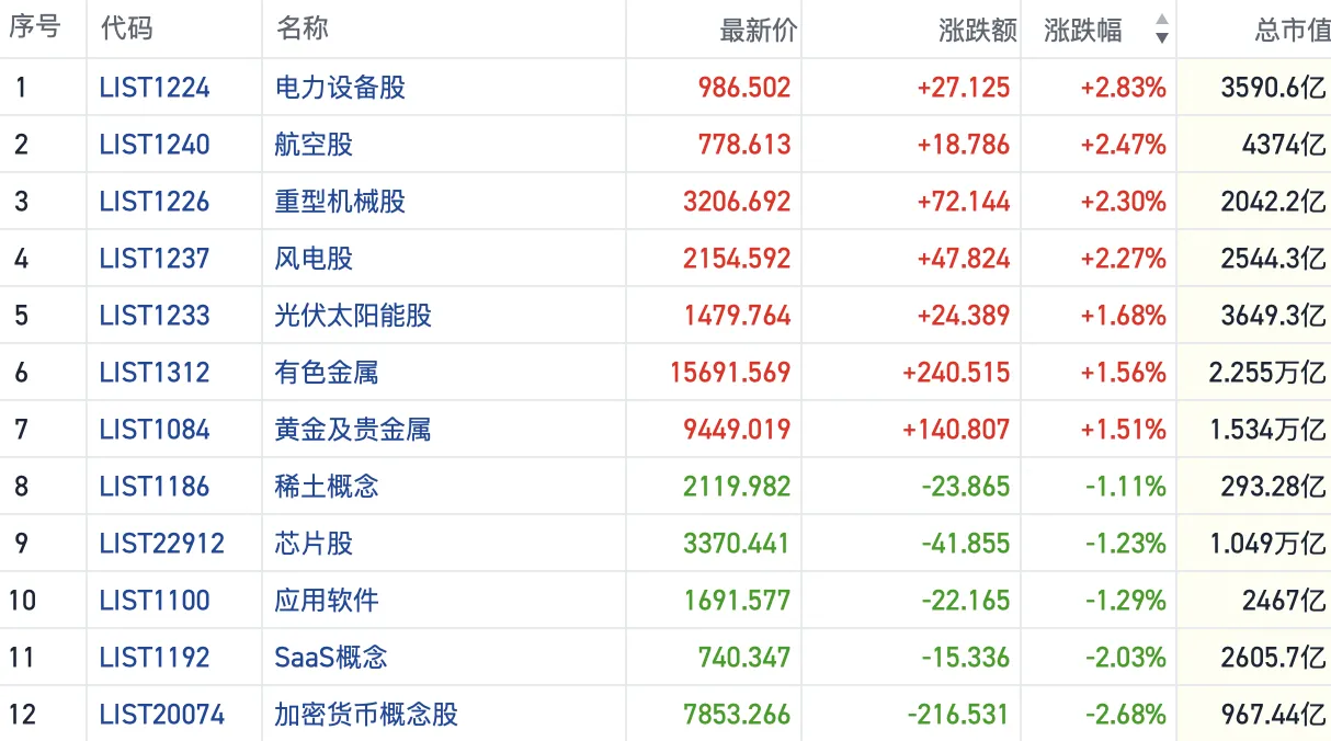 其他方向上,电力设备、储能等板块表现强势,航空股跟涨,有色板块反弹走强。此外,金融、博彩、手游、家电等行业均有结构性拉升行情。