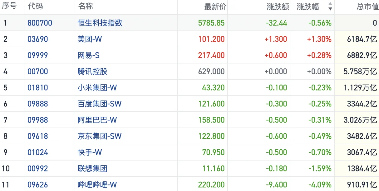 盘面上,受隔夜美股走弱影响,今日大型科网股依旧弱势,京东、阿里巴巴、百度、小米皆有跌幅,美团逆势涨1.3%。