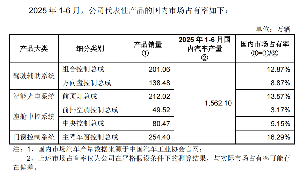 作为国内全车身电控系统供应商的佼佼者,大明电子的产品在国内汽车电子市场中占据了显著的份额。以2025年1-6月为例,公司在多个细分产品领域市场占有率位居行业前列,如主驾车窗控制总成、前顶灯总成、组合控制总成三大代表性产品的国内市占率均超12%。
