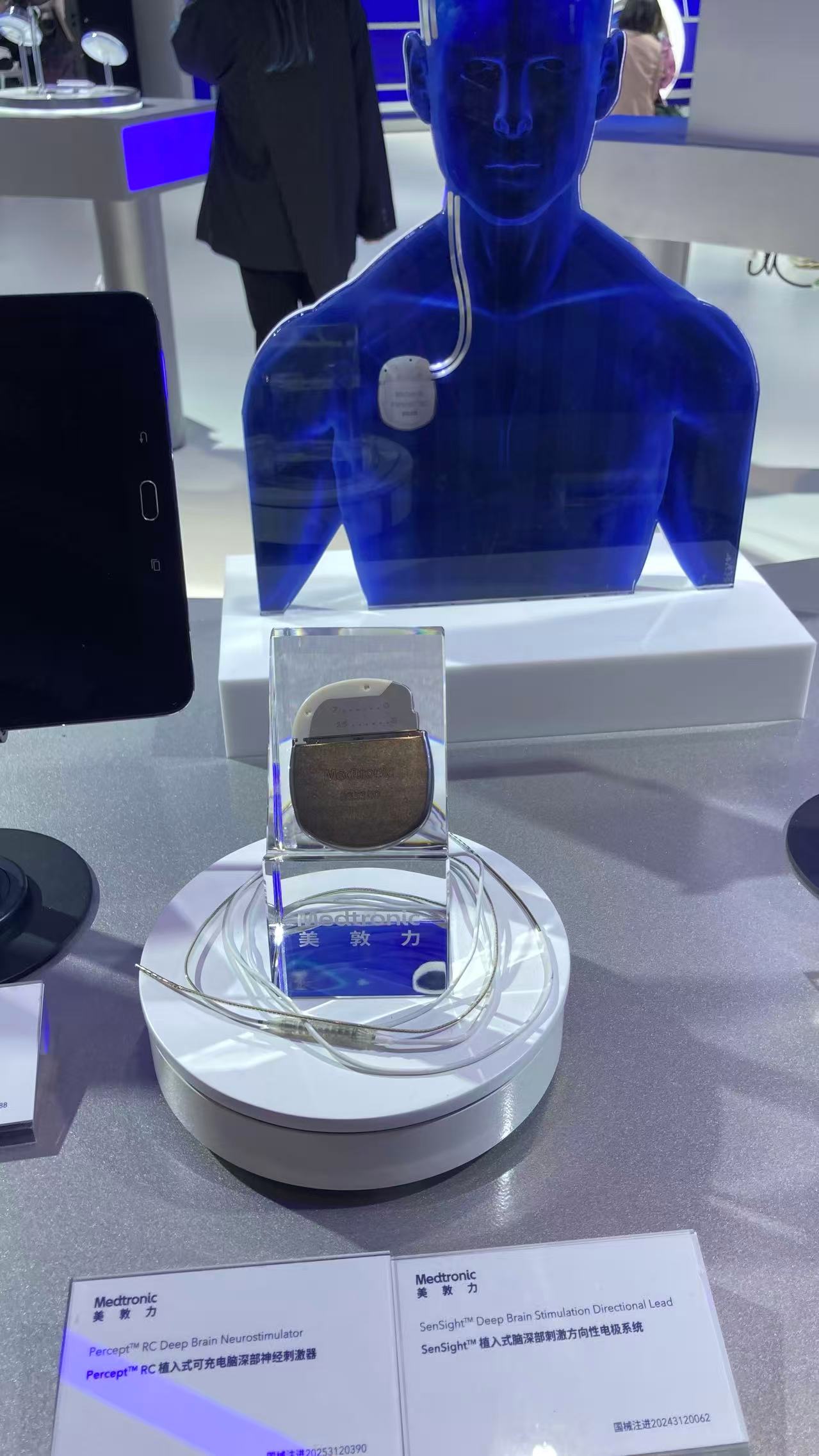 另一款来自美敦力的可充电、可感知闭环脑起搏器Percept RC,则是同时融合了人工智能和脑机接口技术。展台工作人员介绍:“这款设备不仅能实时监测大脑信号,还能根据患者的不同状态自动调整治疗方案,实现‘读脑-释义-反馈-疗愈’的完整闭环”。据悉,该产品在去年完成进博首展后,今年随即获批并即将在国内投入临床应用
