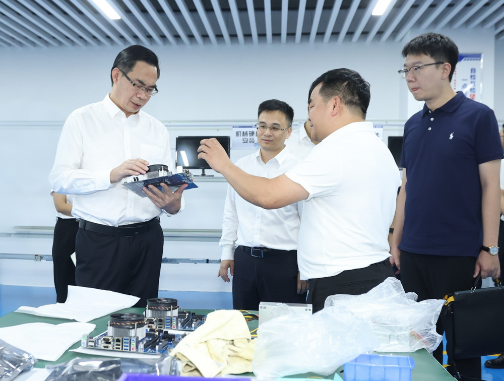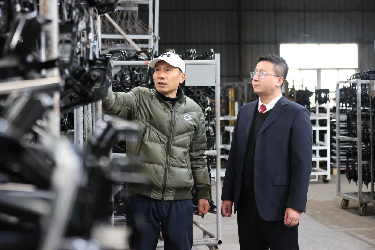 柳州银行党委书记、董事长谢斌(左)带队走访科技企业