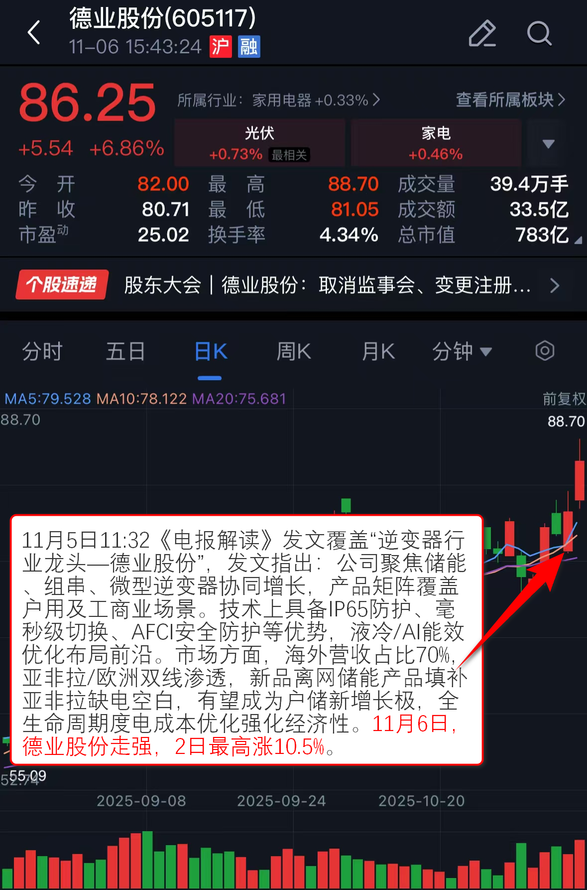 11月5日11:32《电报解读》发文覆盖“逆变器行业龙头—德业股份”,发文指出:公司聚焦储能、组串、微型逆变器协同增长,产品矩阵覆盖户用及工商业场景。技术上具备IP65防护、毫秒级切换、AFCI安全防护等优势,液冷/AI能效优化布局前沿。市场方面,海外营收占比70%,亚非拉/欧洲双线渗透,新品离网储能产品填补亚非拉缺电空白,有望成为户储新增长极,全生命周期度电成本优化强化经济性。11月6日,德业股份走强,2日最高涨10.5%