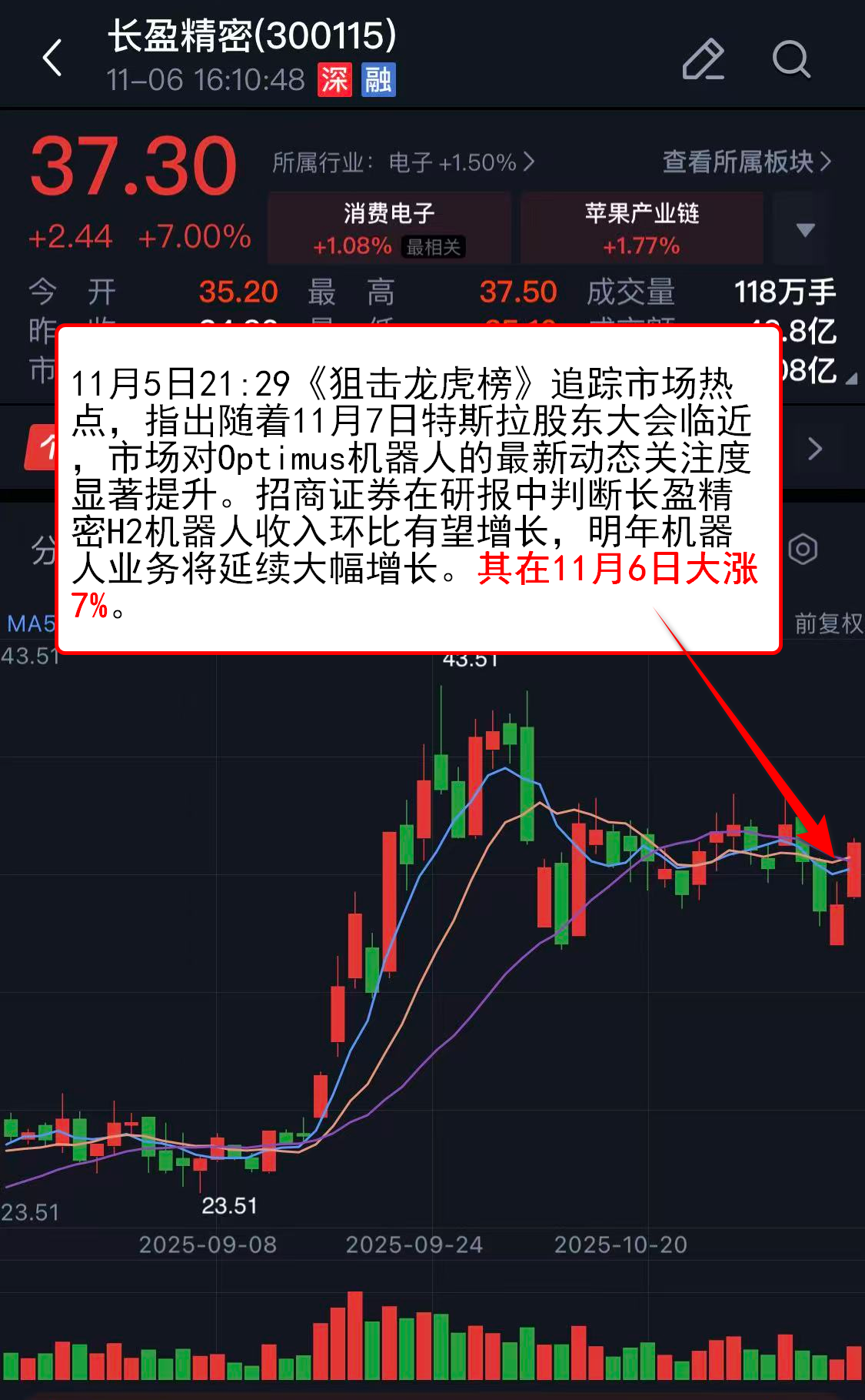 11月5日21:29《狙击龙虎榜》追踪市场热点,指出随着11月7日特斯拉股东大会临近,市场对Optimus机器人的最新动态关注度显著提升。招商证券在研报中判断长盈精密H2机器人收入环比有望增长,明年机器人业务将延续大幅增长。其在11月6日大涨7%。