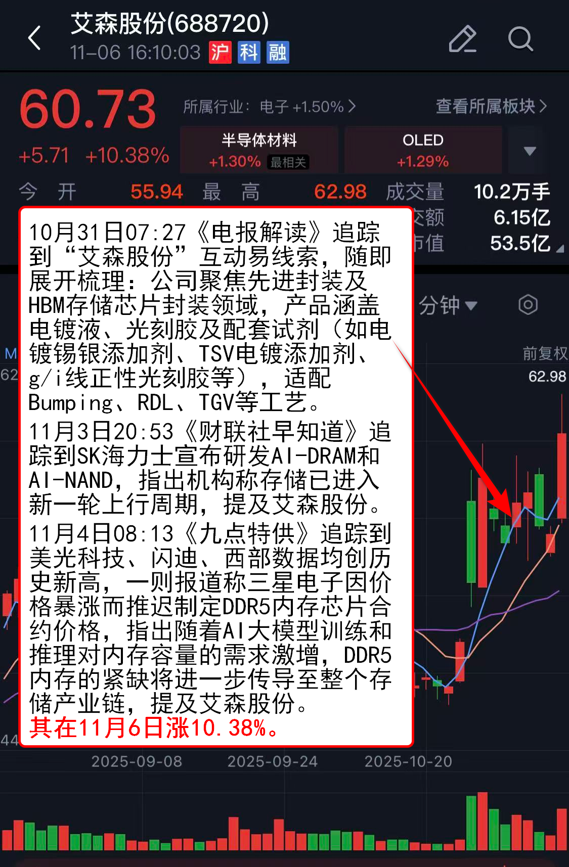 11月3日20:53《财联社早知道》追踪到SK海力士宣布研发AI-DRAM和AI-NAND,指出机构称存储已进入新一轮上行周期,提及艾森股份。