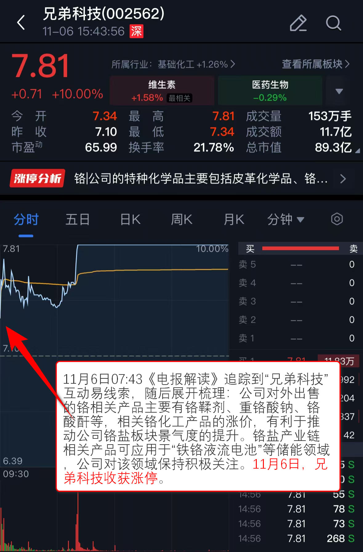 11月6日07:43《电报解读》追踪到“兄弟科技”互动易线索,随后展开梳理:公司对外出售的铬相关产品主要有铬鞣剂、重铬酸钠、铬酸酐等,相关铬化工产品的涨价,有利于推动公司铬盐板块景气度的提升。铬盐产业链相关产品可应用于“铁铬液流电池”等储能领域,公司对该领域保持积极关注。11月6日,兄弟科技收获涨停。