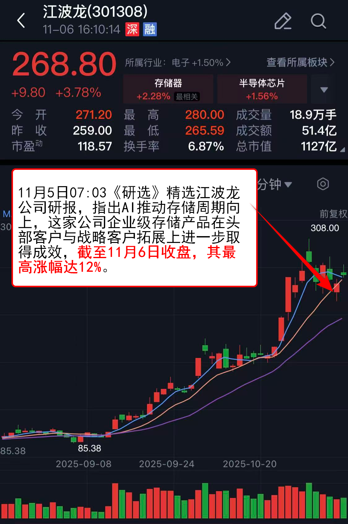 11月5日07:03《研选》精选江波龙公司研报,指出AI推动存储周期向上,这家公司企业级存储产品在头部客户与战略客户拓展上进一步取得成效,截至11月6日收盘,其最高涨幅达12%。