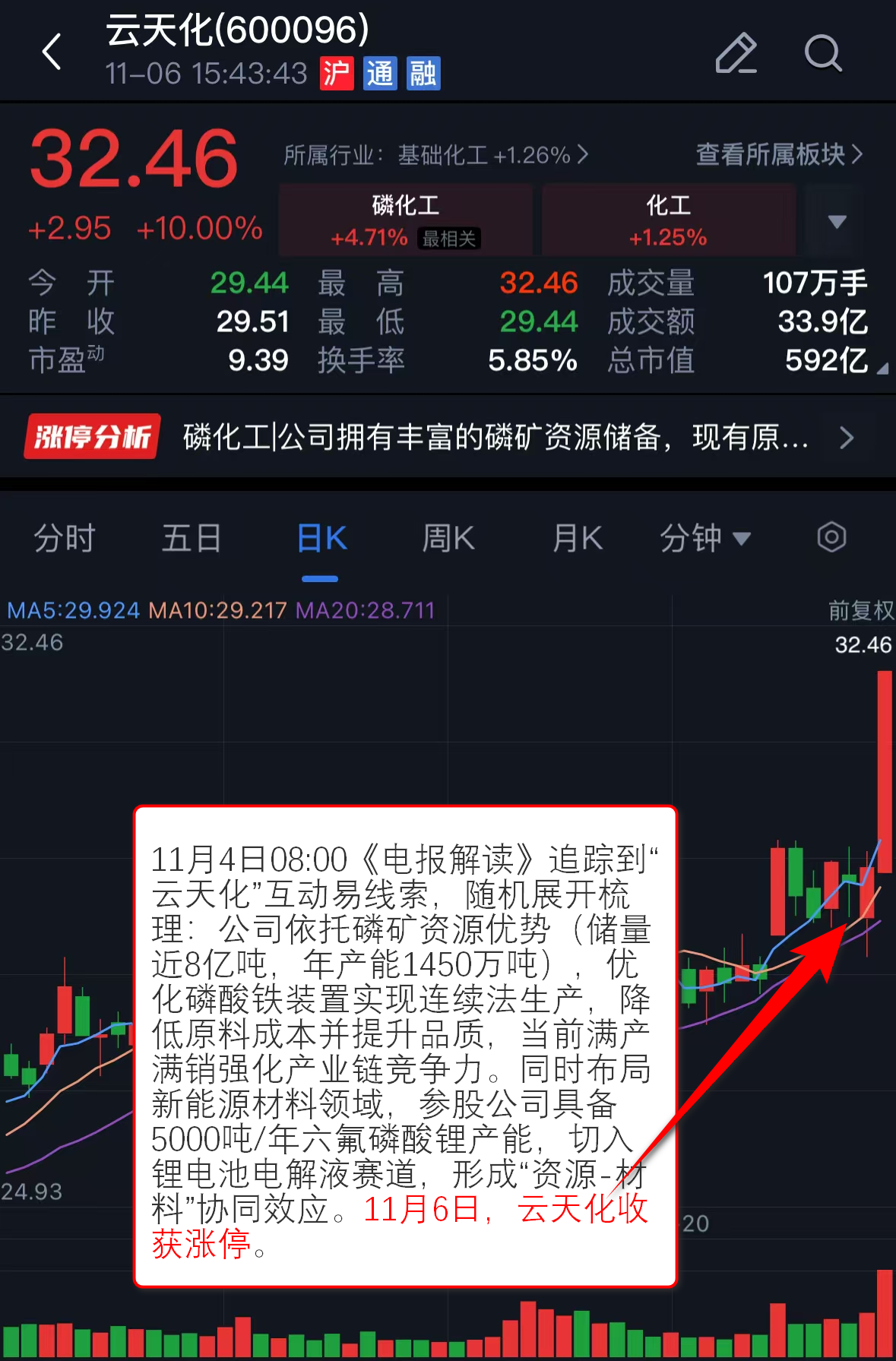 11月4日08:00《电报解读》追踪到“云天化”互动易线索,随机展开梳理:公司依托磷矿资源优势(储量近8亿吨,年产能1450万吨),优化磷酸铁装置实现连续法生产,降低原料成本并提升品质,当前满产满销强化产业链竞争力。同时布局新能源材料领域,参股公司具备5000吨/年六氟磷酸锂产能,切入锂电池电解液赛道,形成“资源-材料”协同效应。11月6日,云天化收获涨停。