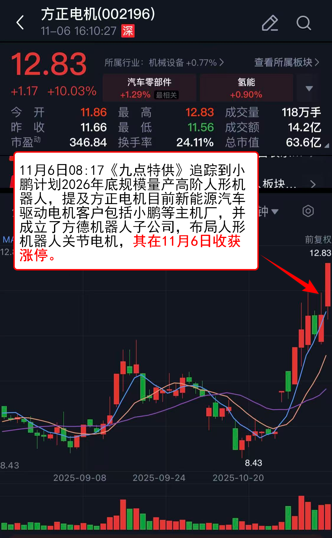 11月6日08:17《九点特供》追踪到小鹏计划2026年底规模量产高阶人形机器人,提及方正电机目前新能源汽车驱动电机客户包括小鹏等主机厂,并成立了方德机器人子公司,布局人形机器人关节电机,其在11月6日收获涨停。