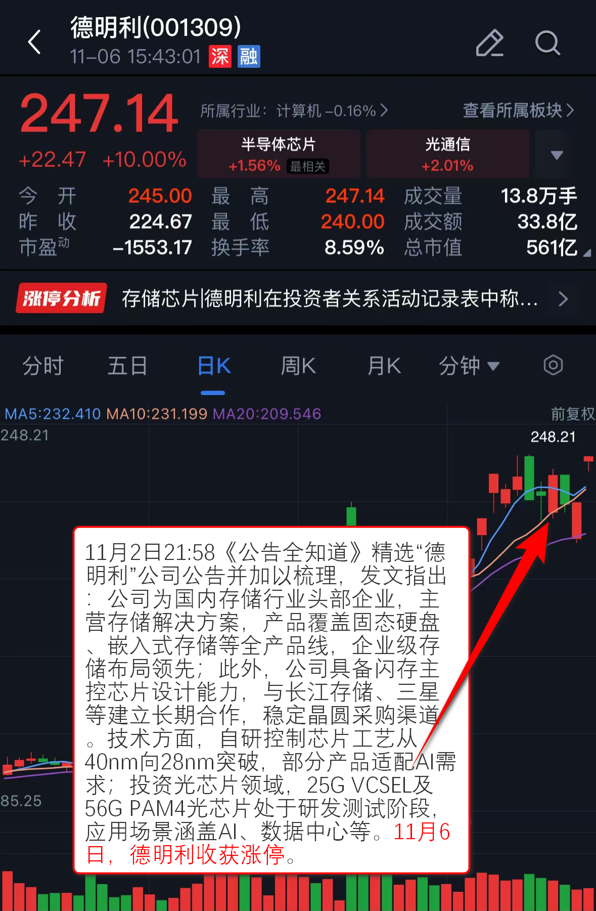 11月2日21:58《公告全知道》精选“德明利”公司公告并加以梳理,发文指出:公司为国内存储行业头部企业,主营存储解决方案,产品覆盖固态硬盘、嵌入式存储等全产品线,企业级存储布局领先;此外,公司具备闪存主控芯片设计能力,与长江存储、三星等建立长期合作,稳定晶圆采购渠道。技术方面,自研控制芯片工艺从40nm向28nm突破,部分产品适配AI需求;投资光芯片领域,25G VCSEL及56G PAM4光芯片处于研发测试阶段,应用场景涵盖AI、数据中心等。11月6日,德明利收获涨停。