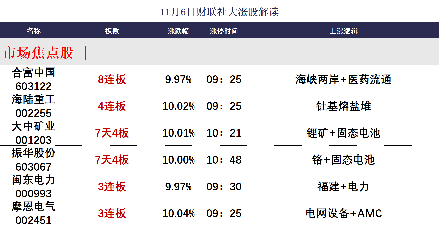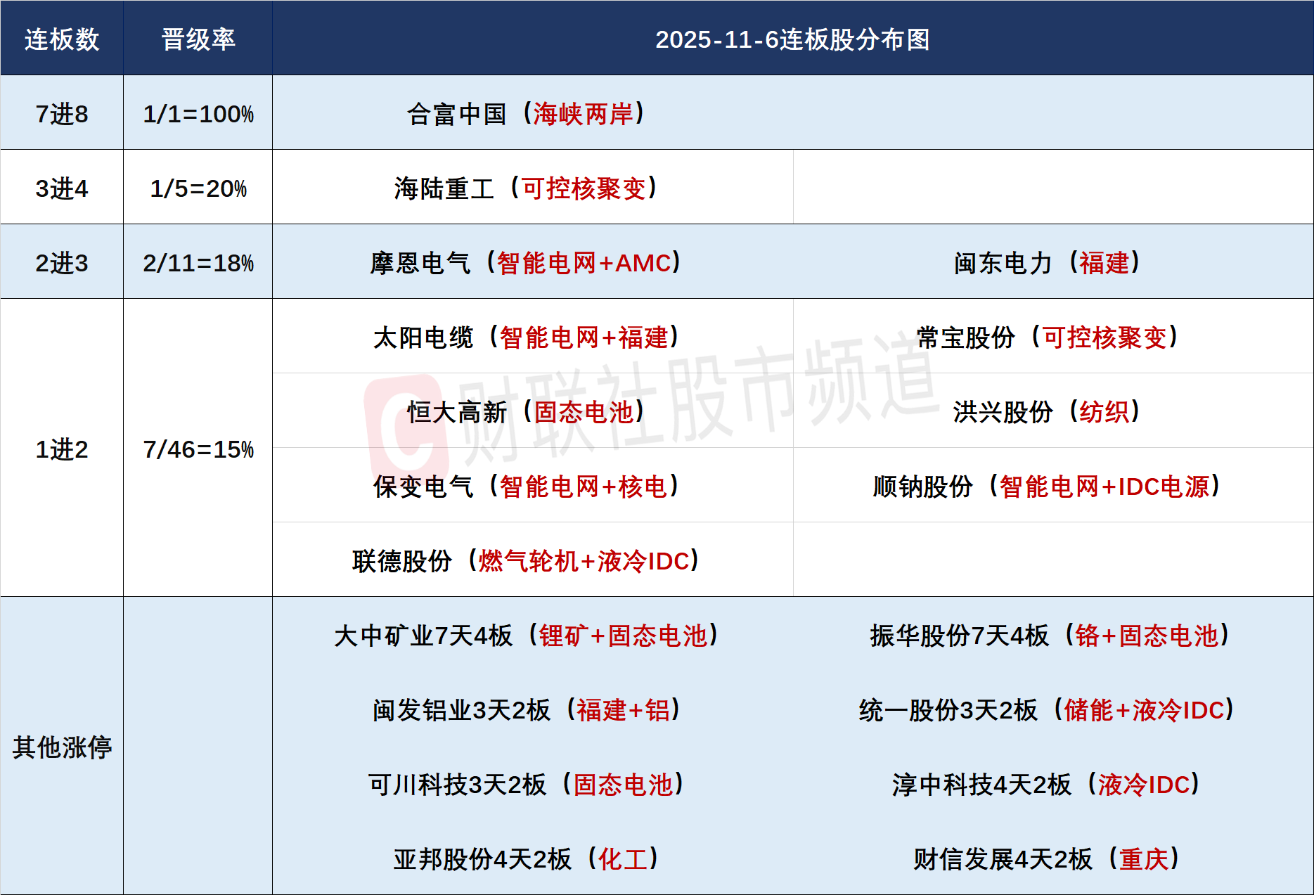 财联社11月6日讯,今日62股涨停,33股炸板,封板率为65%,合富中国8连板,海陆重工4连板,摩恩电气、闽东电力3连板,大中矿业、振华股份7天4板,联德股份6天3板。市场全天震荡走强,沪指放量涨近1%重回4000点。沪深两市成交额2.06万亿,较上一个交易日放量1829亿。盘面上,市场热点快速轮动,全市场近2900只个股上涨。板块方面,磷化工、半导体、CPO等板块涨幅居前,海南、影视院线、旅游及酒店等板块跌幅居前。截至收盘,沪指涨0.97%,深成指涨1.73%,创业板指涨1.84%。