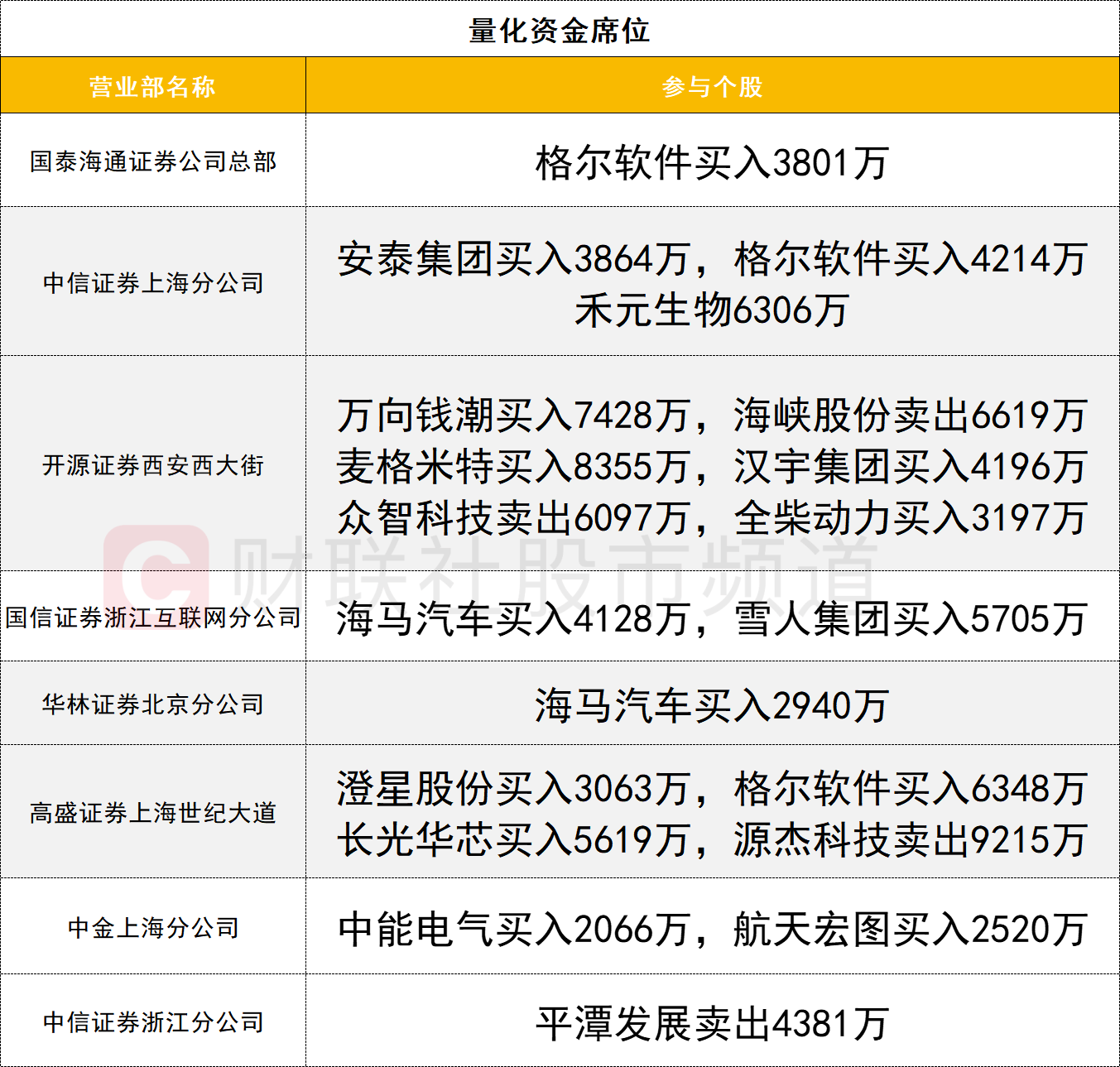 量化资金活跃度一般,量子科技人气股格尔软件获多家量化席位买入。