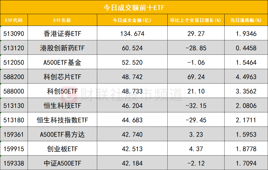 从成交额前十的ETF来看,香港证券ETF(513090)成交额位居首位,港股创新药ETF(513120)成交额位居次席。