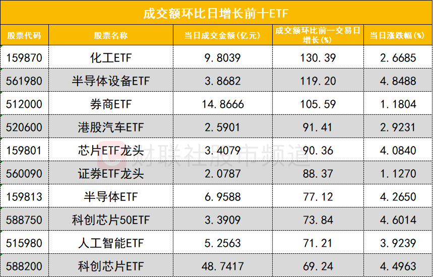 从成交额环比增长前十的ETF来看,化工ETF(159870)成交额环比增长130%位居首位;半导体设备ETF(561980)成交额环比增长119%位居次席。