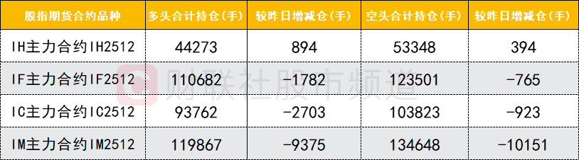 四大期指主力合约中,IF、IC、IM合约多空双方均减仓,IC合约多头减仓数量较多,IM合约空头减仓数量较多。