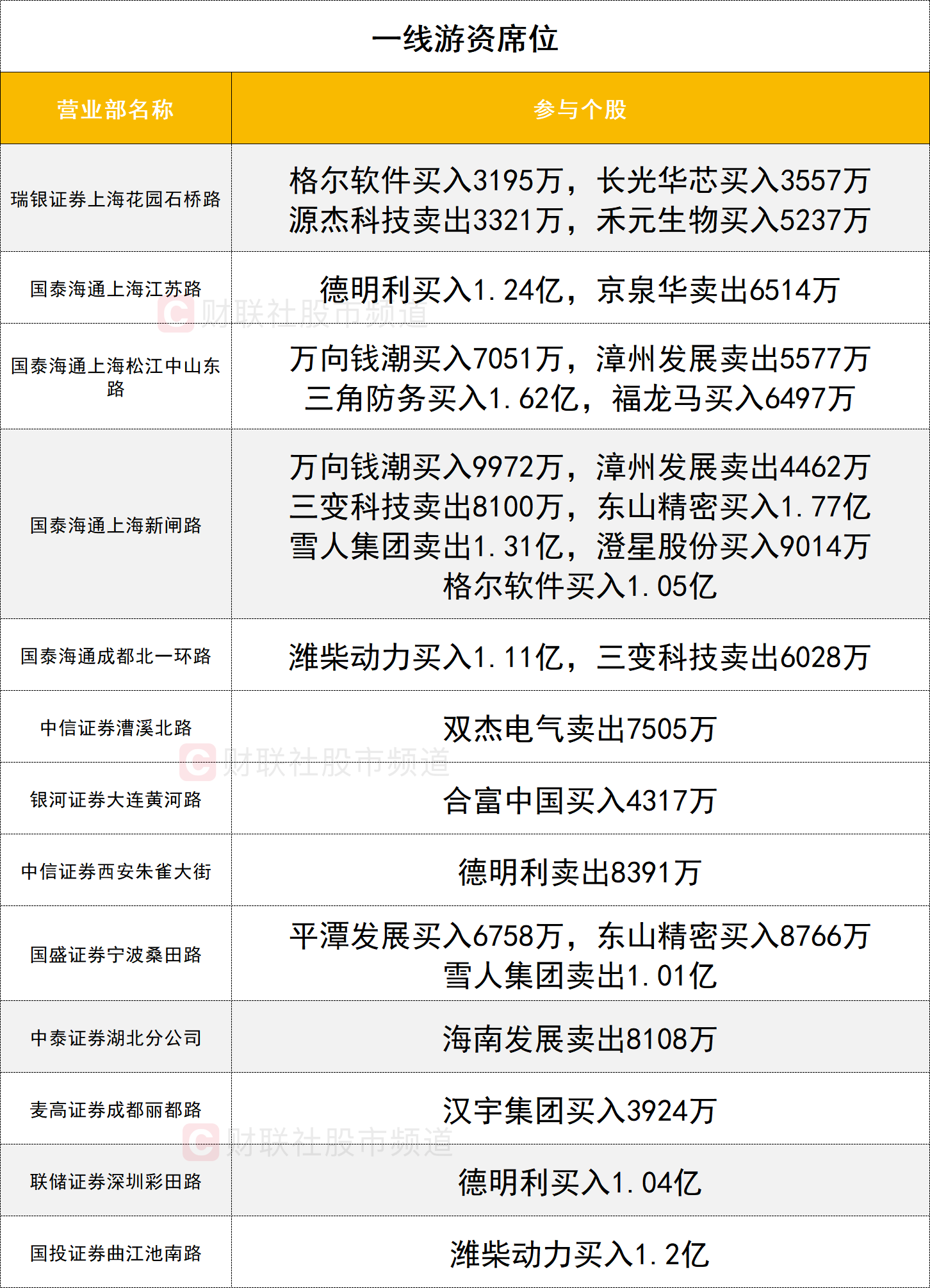 一线游资活跃度较高,潍柴动力获两家一线游资席位(国投证券西安曲江池南路、国泰海通证券成都北一环路)合计买入2.31亿。存储芯片人气股德明利今日涨停,获两家一线游资(国泰海通证券上海江苏路、联储证券深圳彩田路)分别买入1.24亿、1.04亿,却遭另一家一线游资(中信证券西安朱雀大街)卖出8391万。