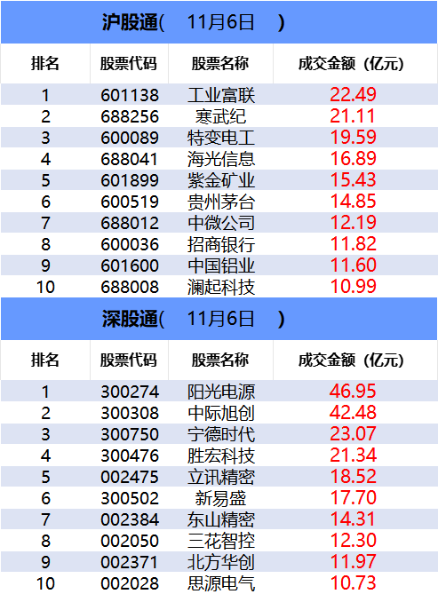 从沪股通前十大成交个股来看,工业富联位居首位;寒武纪和特变电工分居二、三位。
