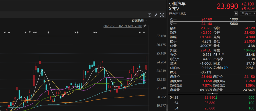 《科创板日报》11月7日讯 在何小鹏的两度自证下,资本市场给小鹏汽车投下了信任票。昨夜今晨,小鹏汽车美股开盘后大涨,盘中一度涨超14%,截至收盘涨9.64%,报23.89美元,总市值228亿美元。