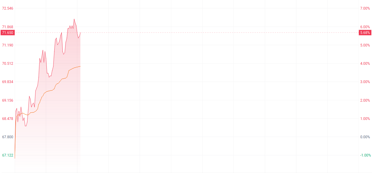 财联社11月7日讯(编辑 胡家荣)在海南全岛封关运作倒计时之际,中国中免(01880.HK)今日延续近期活跃态势,盘中一度大涨超过6%。截至发稿,涨5.68%,报71.65港元。