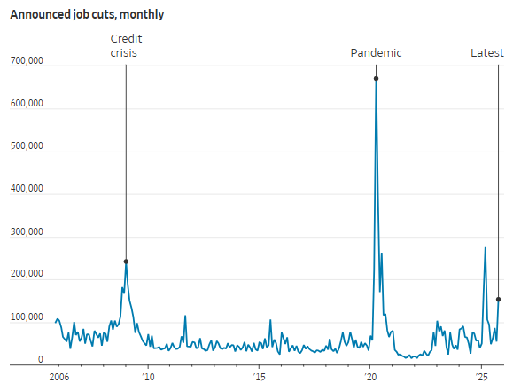 M&T银行与威尔明顿信托首席经济学家Luke Tilley指出,Challenger报告及本周早些时候公布的10月ADP数据均显示企业裁员趋势加剧——自4月以来,员工少于50人的企业累计已裁员逾13万人。