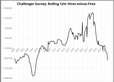 当然,Challenger数据也存在缺陷。Donnelly指出,该数据未经季节性调整,且波动性远高于劳工部发布的官方非农就业报告。“我更信任非农就业数据——但现在的问题是我们没有这份官方数据,”他补充道。