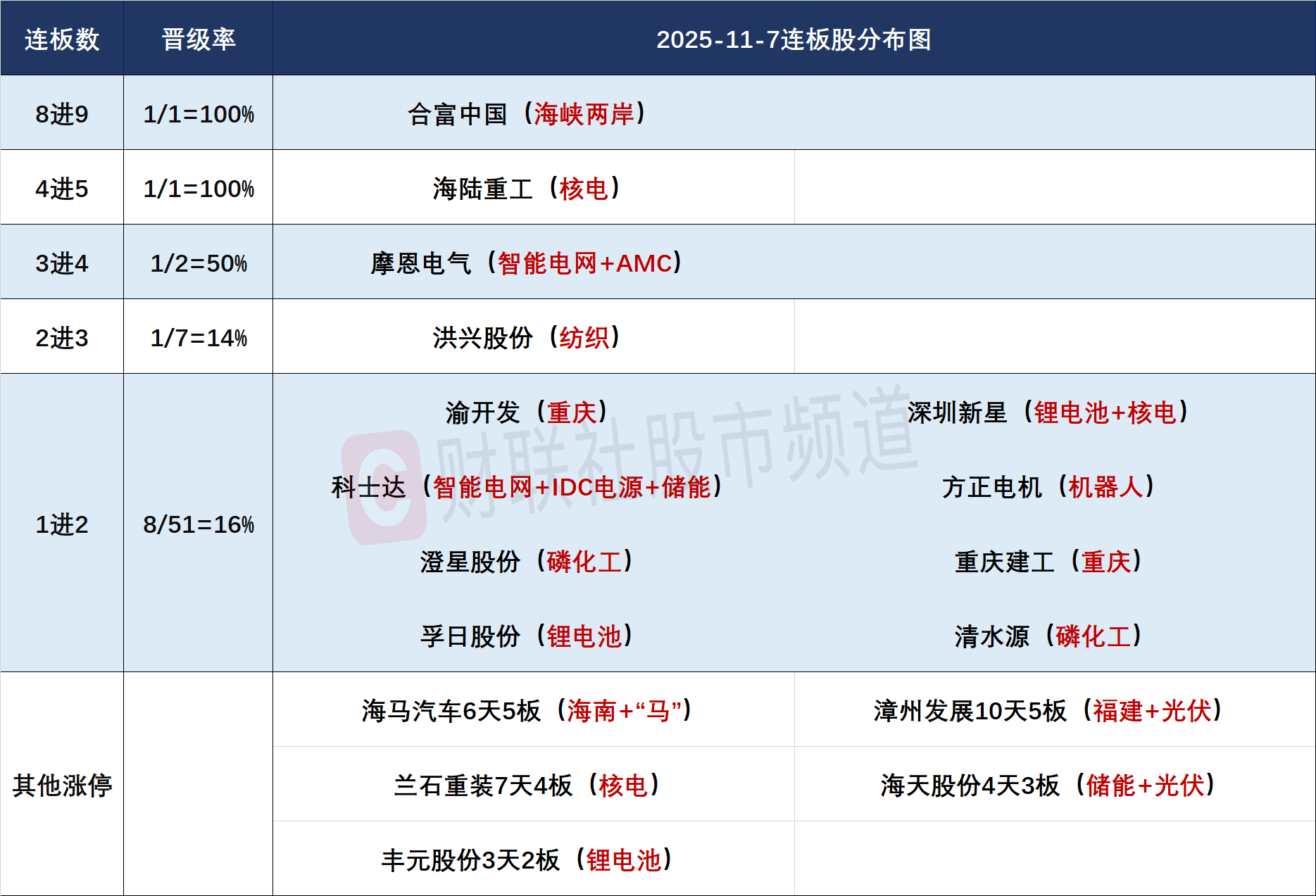 连板晋级率升至36.36%,随着成长赛道在连续反弹后陷入分化,指数震荡之际资金重新回补纯情绪博弈方向,最高标合富中国走出“准地天板”晋级9连板。此外炒地图热度重新回暖,昨日断板的海南自贸概念股海马汽车和福建本地股漳州发展双双走出反包板。随着锂电排产增长需求提振,锂电材料涨价热度从电解液方向持续向磷酸铁锂、隔膜、锂矿等全面扩散,传统化工品方向也展开积极补涨,反映部分成长股资金风偏相对有限,涨价概念成为容纳这类资金的最佳载体。