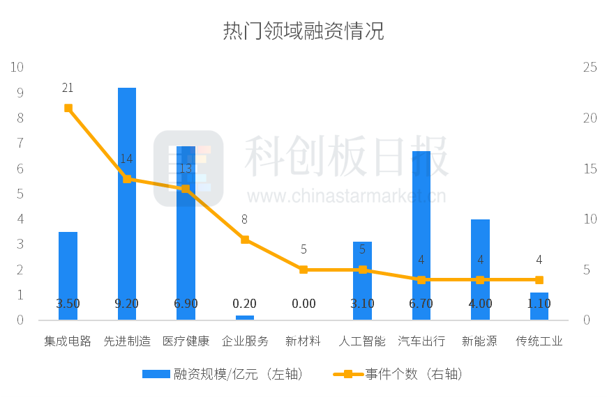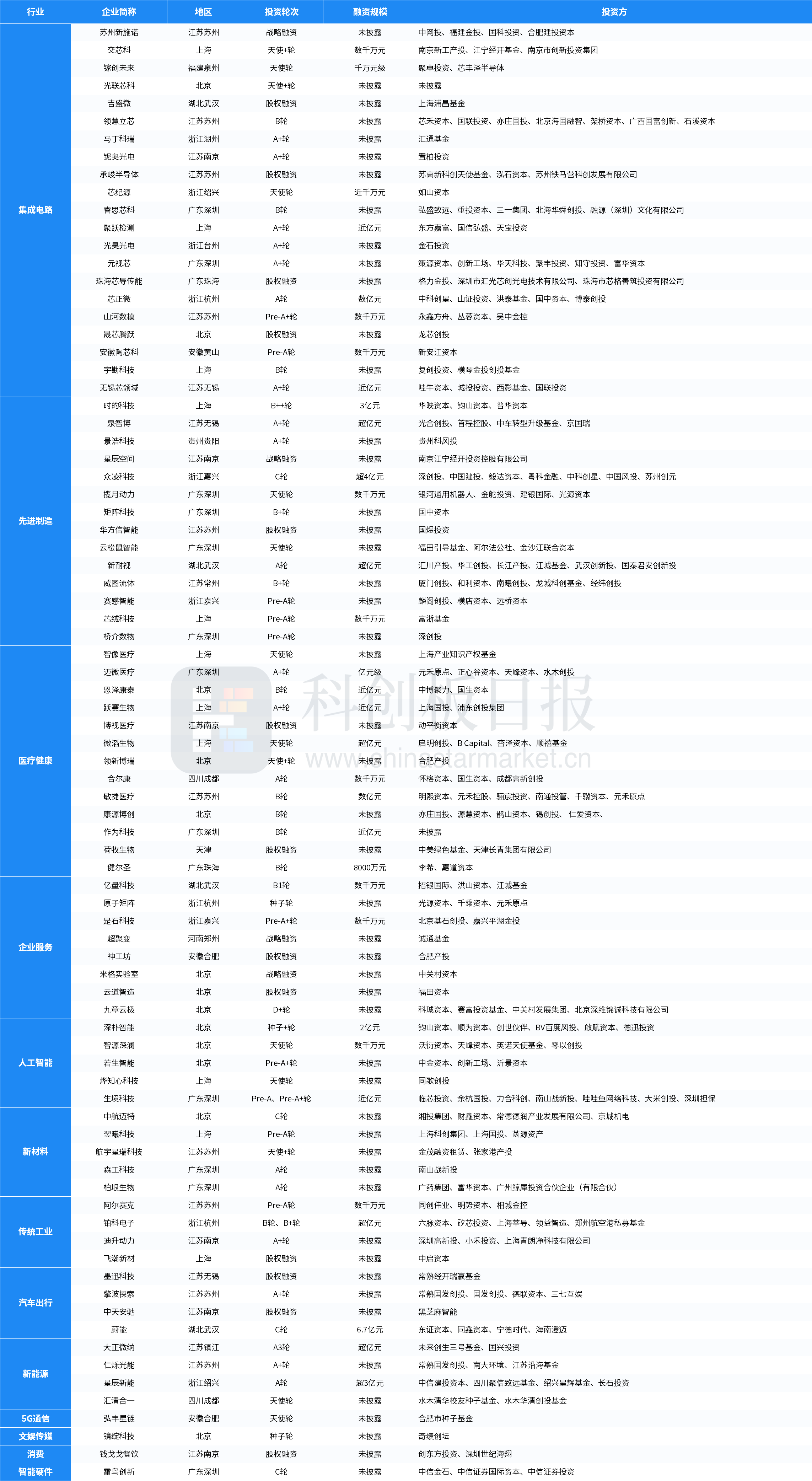 从投资事件数量来看,本周集成电路、先进制造、医疗健康、企业服务、新材料、人工智能等领域较活跃;从融资总额来看,先进制造披露的融资总额最多,约9.20亿元。蔚能完成由创始股东加持,海宁经开、海南澄迈两家国有资本参与的6.7亿元C轮融资,为本周披露金额最高的投资事件。