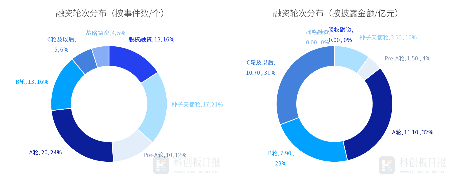 从投资轮次来看,除股权融资外,本周A轮融资事件数最多,发生20起,占比约24%;其次是种子天使轮,发生17起,占比约21%。从各轮次获投金额来看,A轮披露的融资总额最高,约11.10亿元;其次是C轮及以后,约10.70亿元。