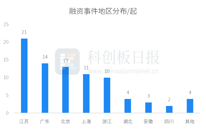 从地区来看,本周江苏、广东、北京、上海、浙江等地公司较受青睐,融资事件数均在10起及以上;江苏以21起融资活跃度保持首位。从单个城市看,北京有13家公司获投,位列第一;深圳紧随其后,有12家公司获投。