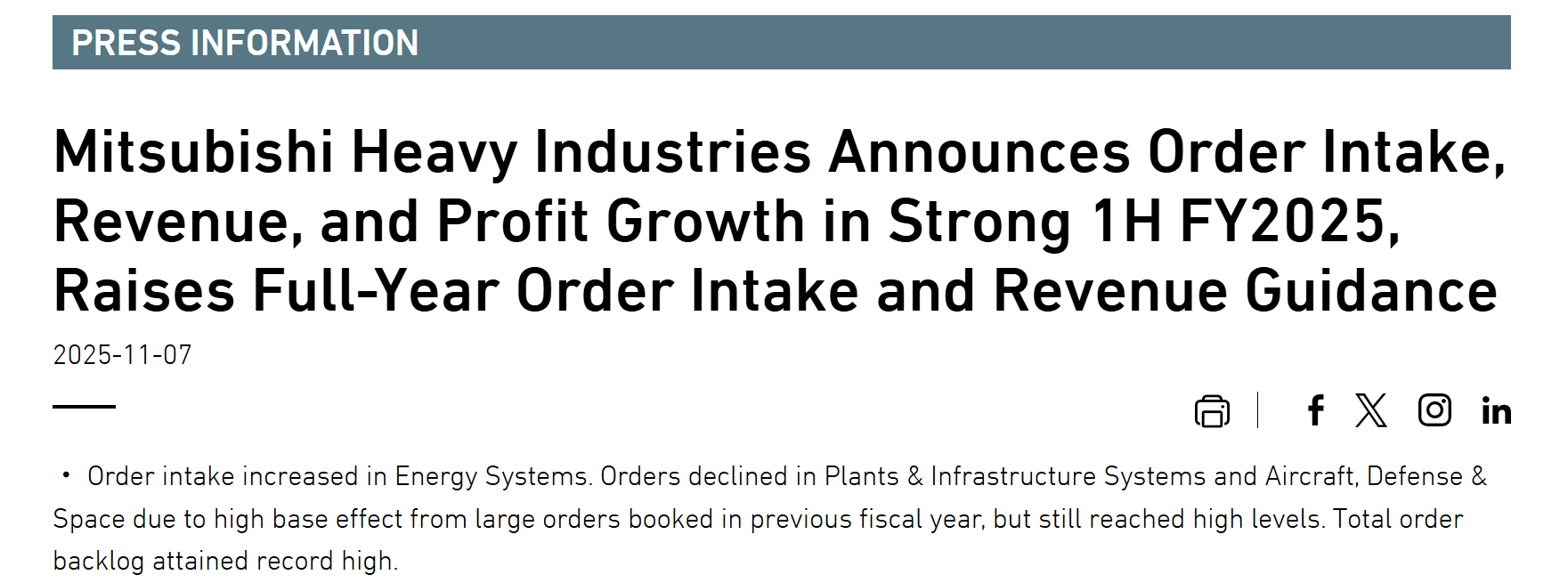 财联社11月8日讯(编辑 史正丞)因数据中心、半导体等工业用电需求激增的预期,全球电力设备巨头三菱重工周五宣布,基于美国和亚洲市场对燃气轮机的强劲需求,显著上调本财年(截至明年3月底)的订单指引。