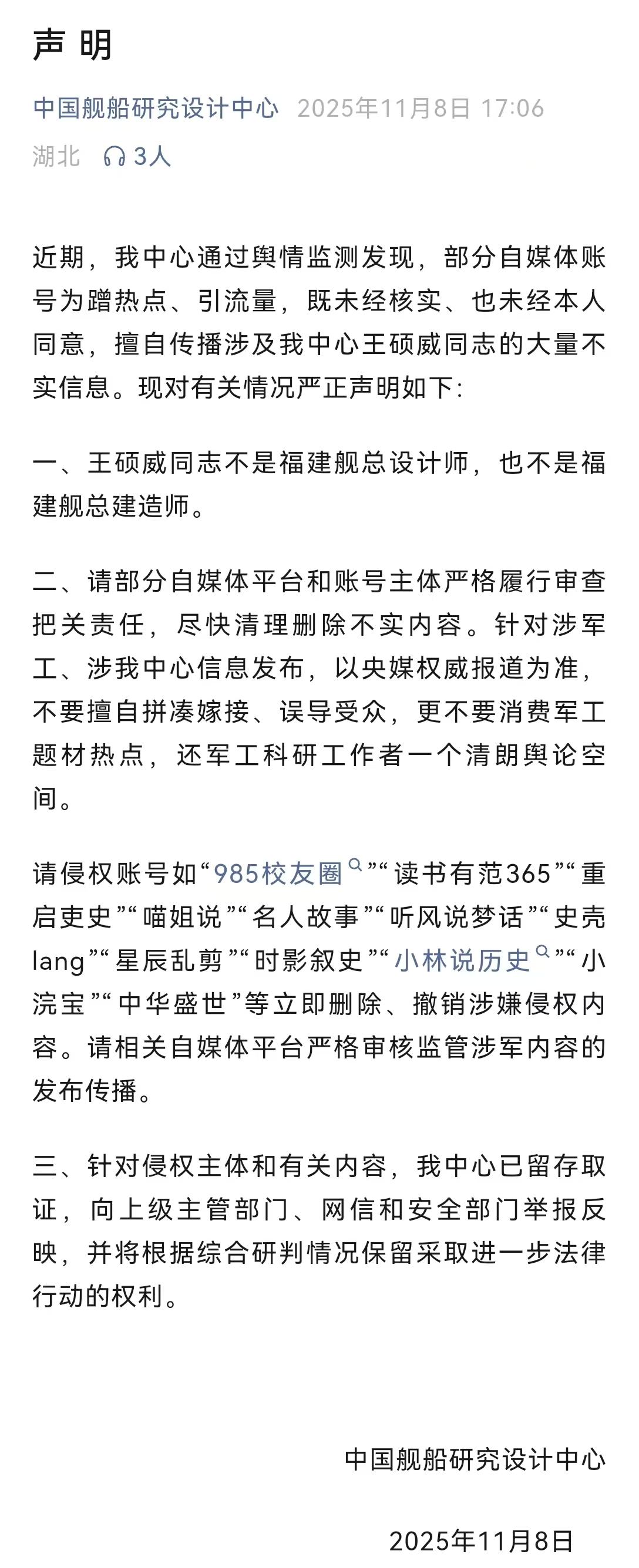 中国舰船研究设计中心公众号11月8日发布一则声明,全文如下:
