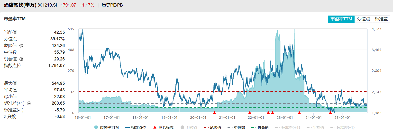 从估值层面来看,以申万二级指数统计,旅游及景区、酒店餐饮、航空机场指数目前市盈率55.14倍、42.55倍、57.87倍,处于近十年65.28%、39.17%、64.39%分位点;市净率3.14倍、1.84倍、2.81倍,处于近十年64.55%、5.16%、83.58%分位点。