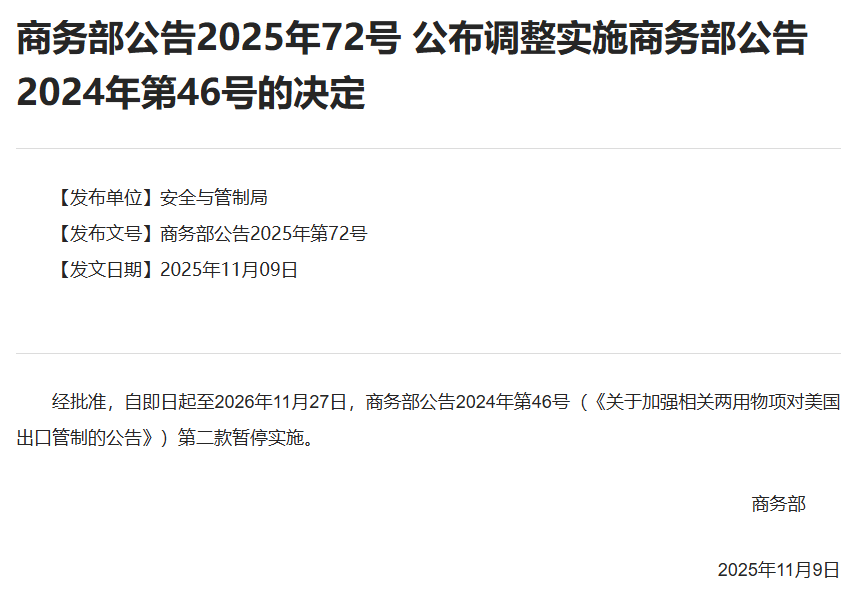 自即日起至2026年11月27日,商务部公告2024年第46号(《关于加强相关两用物项对美国出口管制的公告》)第二款暂停实施。