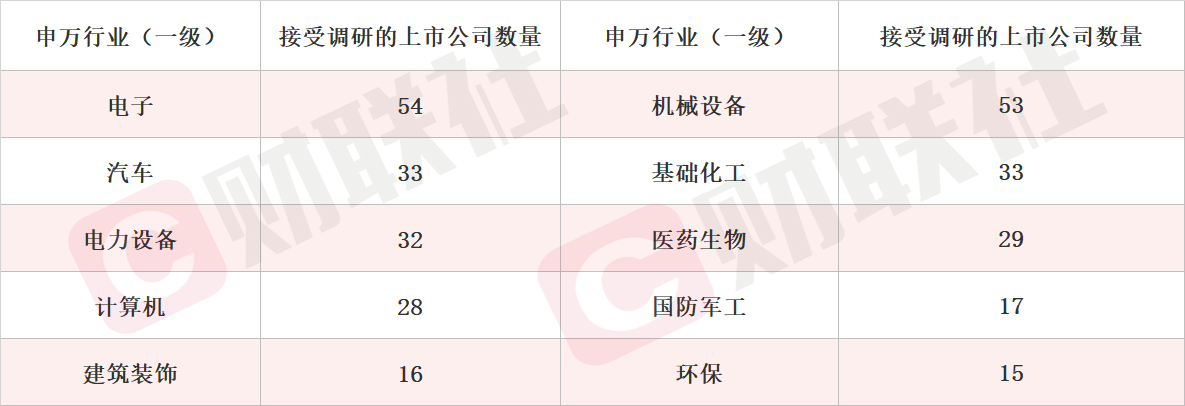 财联社11月9日讯(编辑 宣林)据Choice数据统计,截至今日,沪深两市本周共447家上市公司接受机构调研。按行业划分,电子、机械设备和汽车行业接受机构调研频度最高。此外,建筑装饰、环保等行业关注度有所提升。