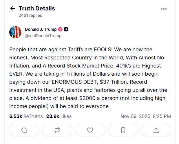 “美国的投资额创下历史新高,工厂和企业如雨后春笋般涌现。每个人都将获得至少2000美元的分红(高收入人群除外!)。”他补充道。