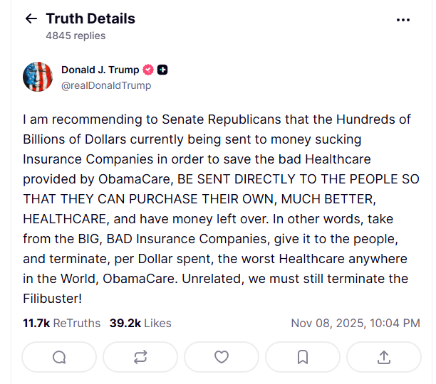 “换句话说,从那些大型保险公司手中拿走钱,交给民众,并彻底废除奥巴马医改——这个世界上最糟糕的医疗保健体系。另外,我们还必须终止冗长辩论!”他补充道。