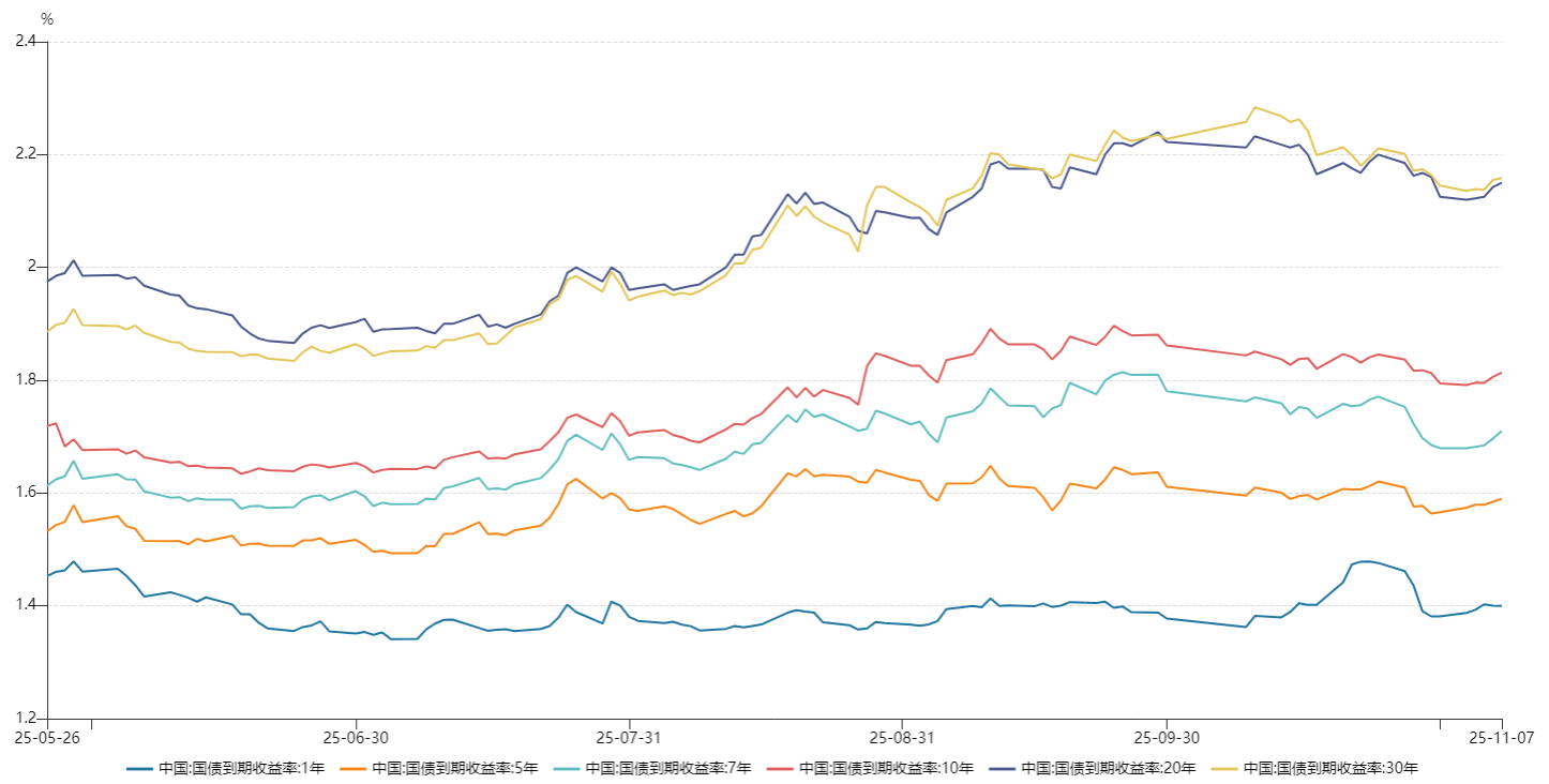上周,主要利率债收益率震荡上行。截至11月7日收盘,1Y、5Y、7Y国债分别报收1.4%、1.59%、1.71%,分别较前一周收盘变动2BP、2BP、3BP;10Y、20Y、30Y国债分别报收1.81%、2.15%、2.16%,分别均较前一周收盘变动2BP、3BP、1BP。