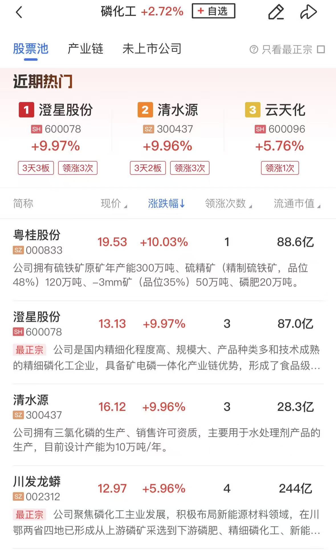 磷化工概念延续强势,澄星股份、安纳达、粤桂股份等涨停,清水源、云天化等个股涨幅居前。