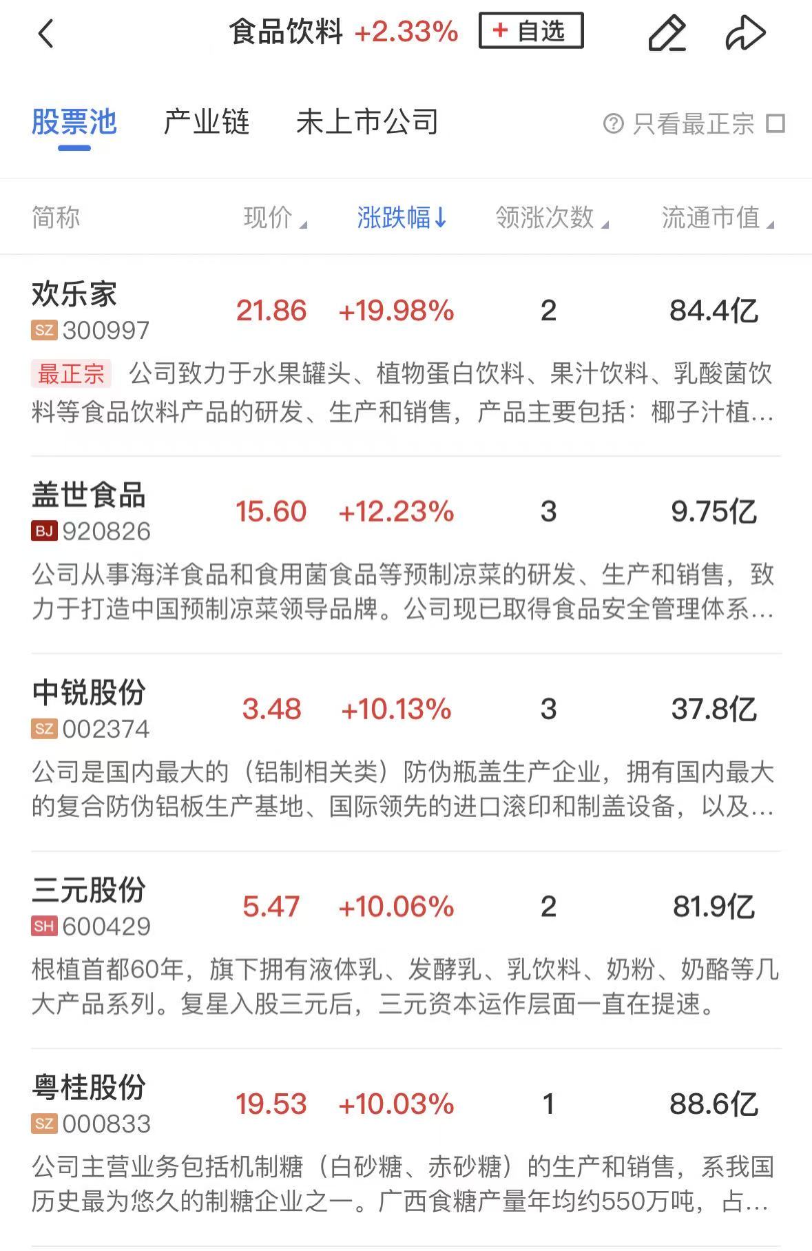 食品饮料方向同样涨幅居前,惠发食品、巴比食品、欢乐家、三元股份、庄园牧场、盐津铺子、一致魔芋、立高食品等个股跟涨。