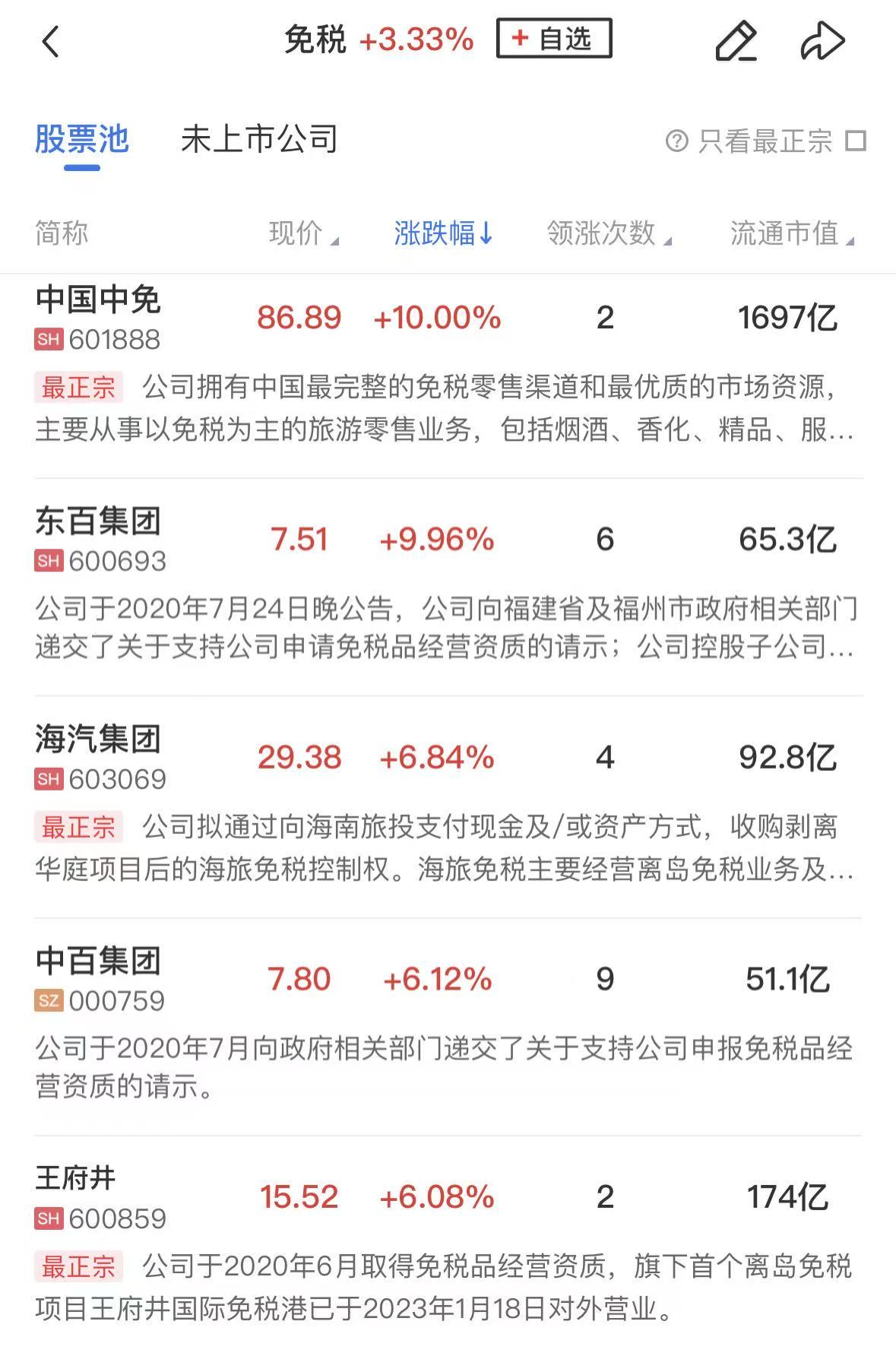 板块上,大消费方向全线爆发,免税板块领涨,中国中免、东百集团双双涨停,海汽集团、王府井、珠免集团、步步高等个股表现亮眼。