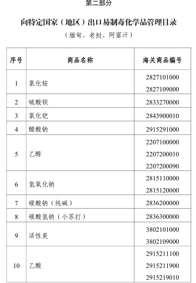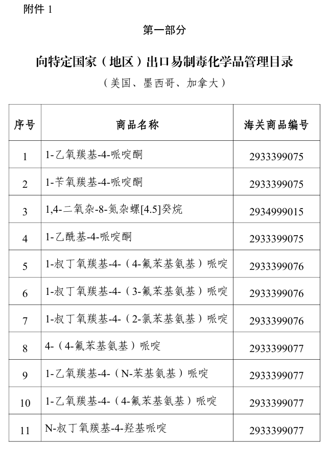 现将调整后的《向特定国家(地区)出口易制毒化学品管理目录》和《特定国家(地区)目录》予以公布。自本公告发布之日起,向美国、墨西哥、加拿大出口附件1第一部分所列化学品的,应按照《向特定国家(地区)出口易制毒化学品暂行管理规定》申请许可,向其他国家(地区)出口无需申请许可。
