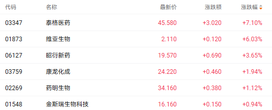 截至收盘,泰格医药(03347.HK)涨7.10%、维亚生物(01873.HK)涨6.03%、昭衍新药(06127.HK)涨3.65%。
