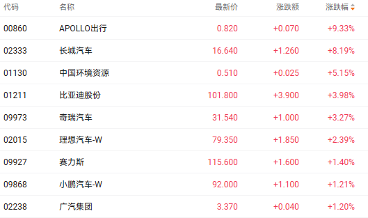 截至收盘,长城汽车(02333.HK)涨8.19%、比亚迪股份(01211.HK)涨3.98%、理想汽车-W(02015.HK)涨2.39%。
