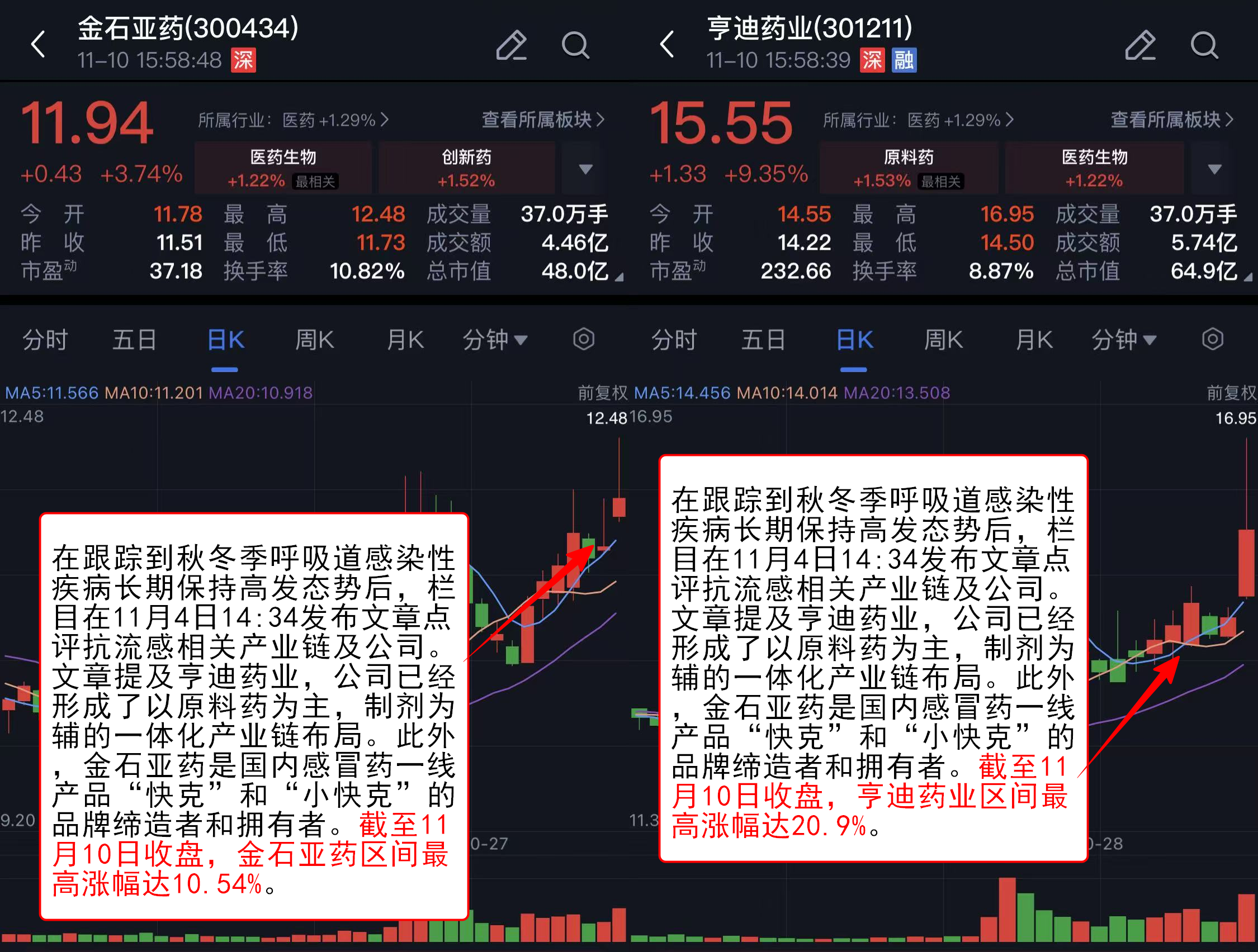在跟踪到秋冬季呼吸道感染性疾病长期保持高发态势后,《盘中宝》栏目在11月4日14:34发布文章点评抗流感相关产业链及公司。文章提及亨迪药业,公司已经形成了以原料药为主,制剂为辅的一体化产业链布局。此外,金石亚药是国内感冒药一线产品“快克”和“小快克”的品牌缔造者和拥有者。截至11月10日收盘,亨迪药业区间最高涨幅达20.9%,金石亚药区间最高涨幅达10.54%。