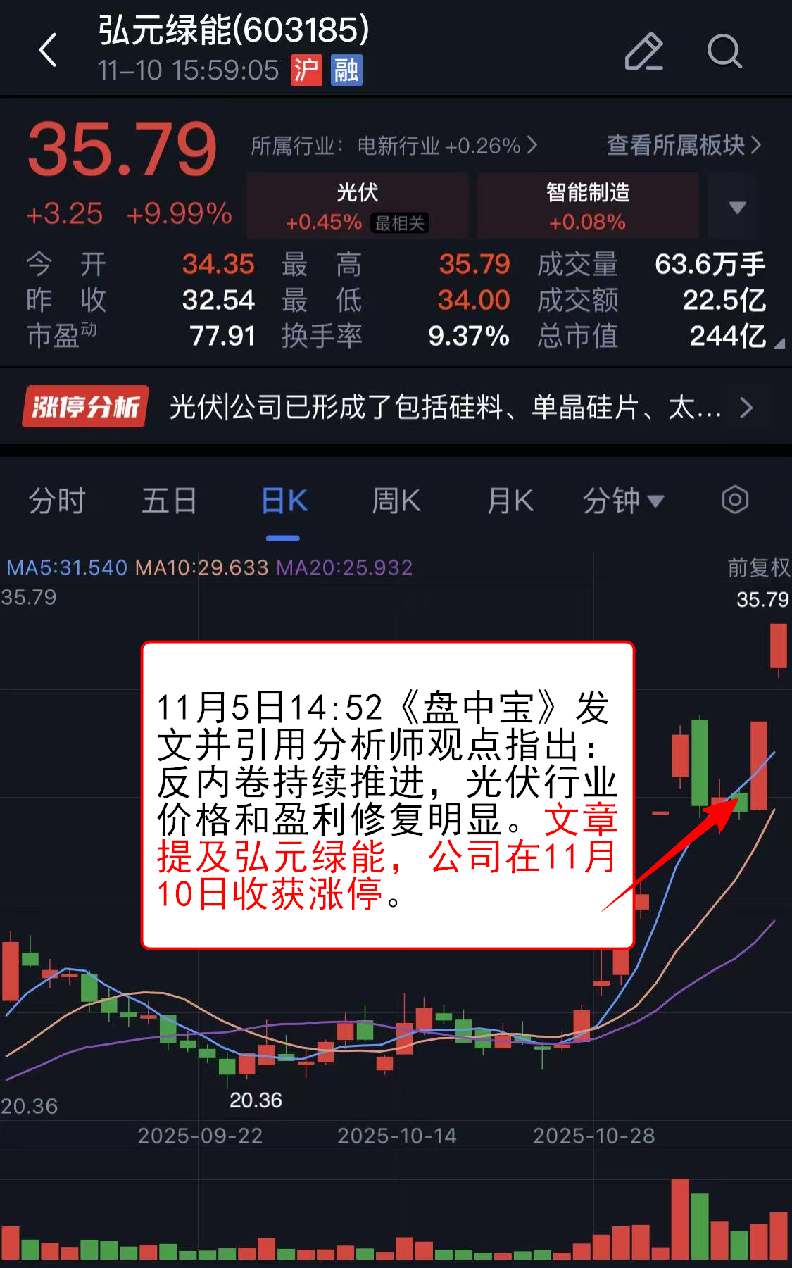11月5日14:52《盘中宝》发文并引用分析师观点指出:反内卷持续推进,光伏行业价格和盈利修复明显。文章提及弘元绿能,公司在11月10日收获涨停。